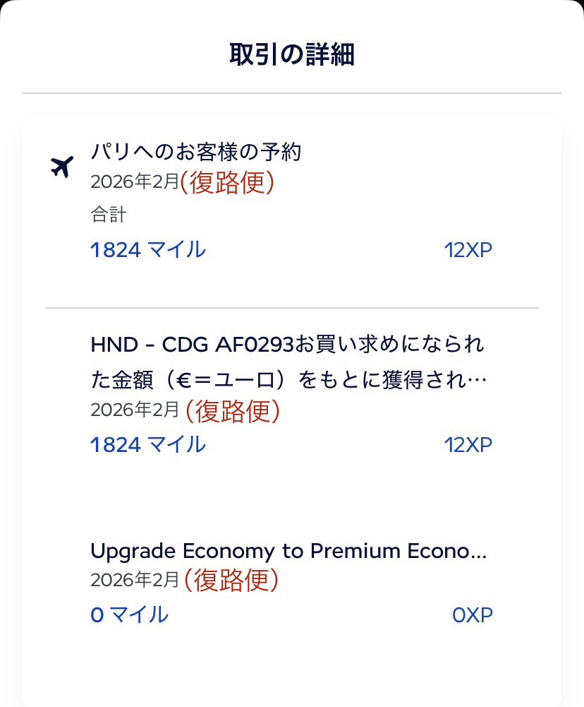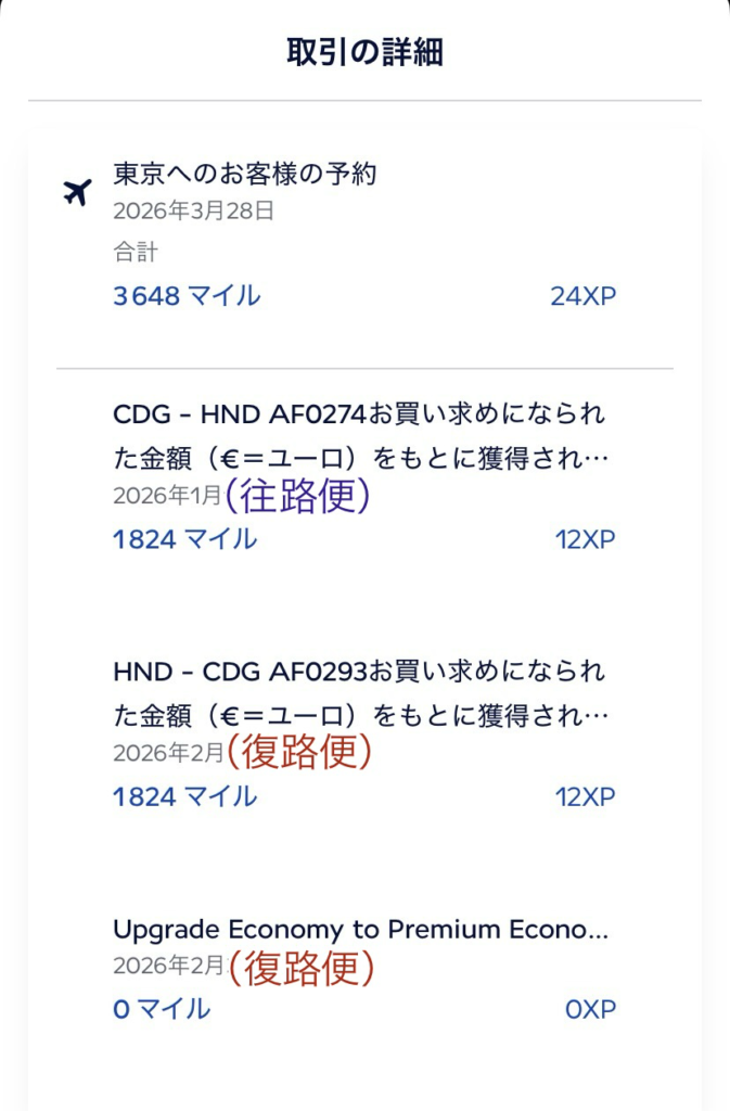 今回のフライトは往復(パリ⇄羽田)で利用しましたが、マイル明細を確認すると