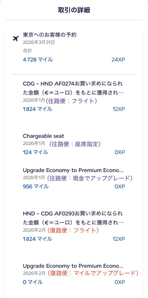 実際に、エールフランス公式アプリからフライング・ブルーのマイル明細を確認すると、アップグレード分のマイルがしっかりと反映されていました。