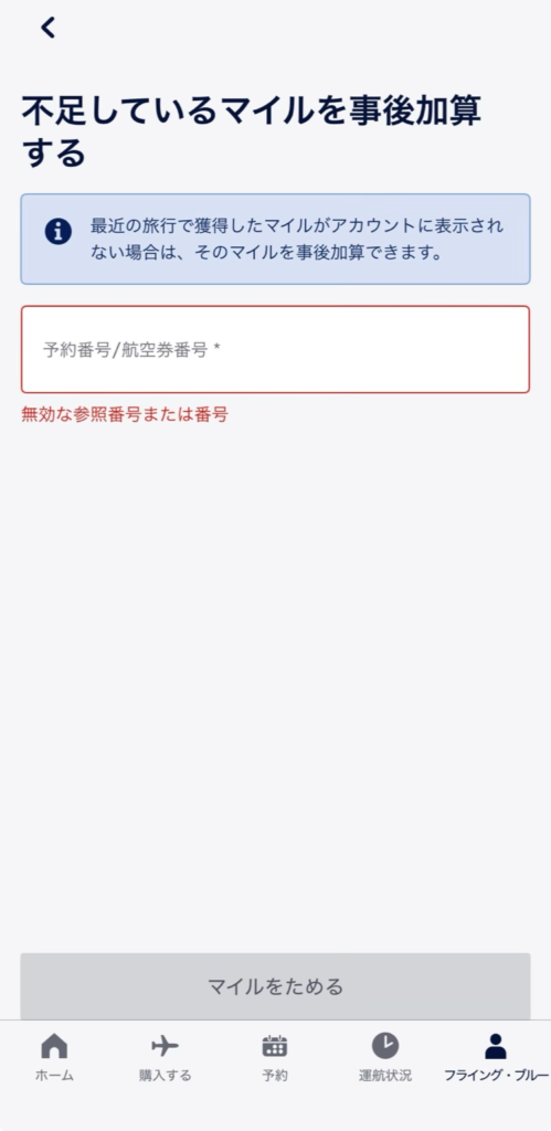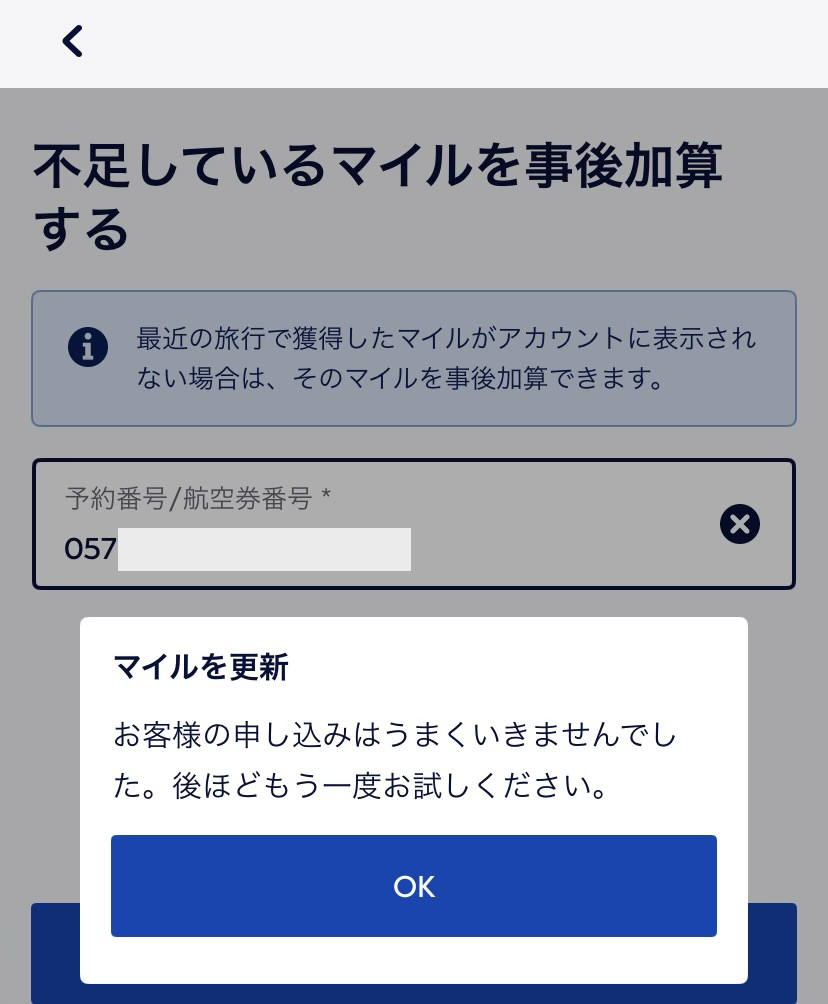 マイルの事後加算の画面でエラー表示が出ても、実際には申請が通っていました。
